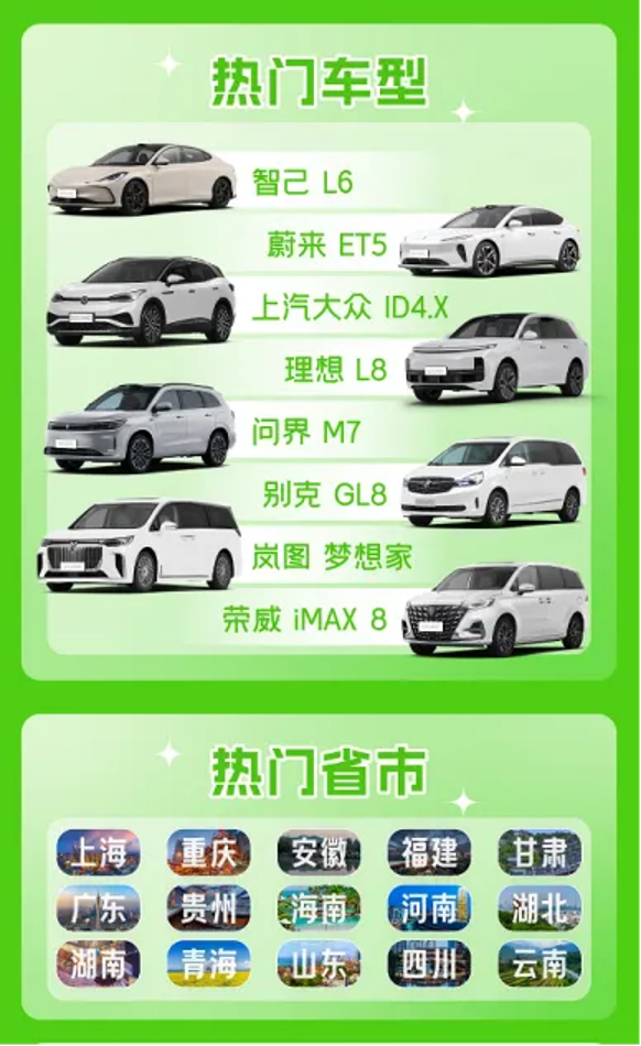 基于“租中高端电车,用EVCARD租车”的品牌定位,本次活动EVCARD租车精选了多款热门新能源车型,包括智己L6、上汽大众ID.4 X、荣威iMAX8、问界M7、理想L8、蔚来ET5、岚图梦想家等,全面满足商务接待、家庭出游、探亲访友等多样化用车场景。